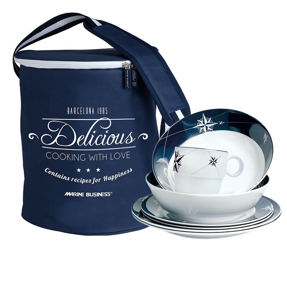 It is made up of 6 dinner plates, 6 soup and dessert bowls, and 6 stackable mugs. All the pieces are made from unbreakable melamine and come in the basket fastener that can be used to store the melamine tableware or as a fruit basket or to store other nautical accessories.