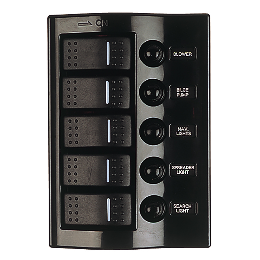 The Wave Rocker Switch Breaker Panel features five ignition protected, illuminating SPST On/Off rocker switches and five thermal resettable breakers (two 3A, two 5A, one 8A, and one 10A). Individual circuit 10A max. 30A total. Includes a sheet of 20 preprinted decals to customize to your specific application. Label decals are back lit with green LEDs. Constructed of injection molded nylon. Installs with six fasteners (not included). 12VDC.